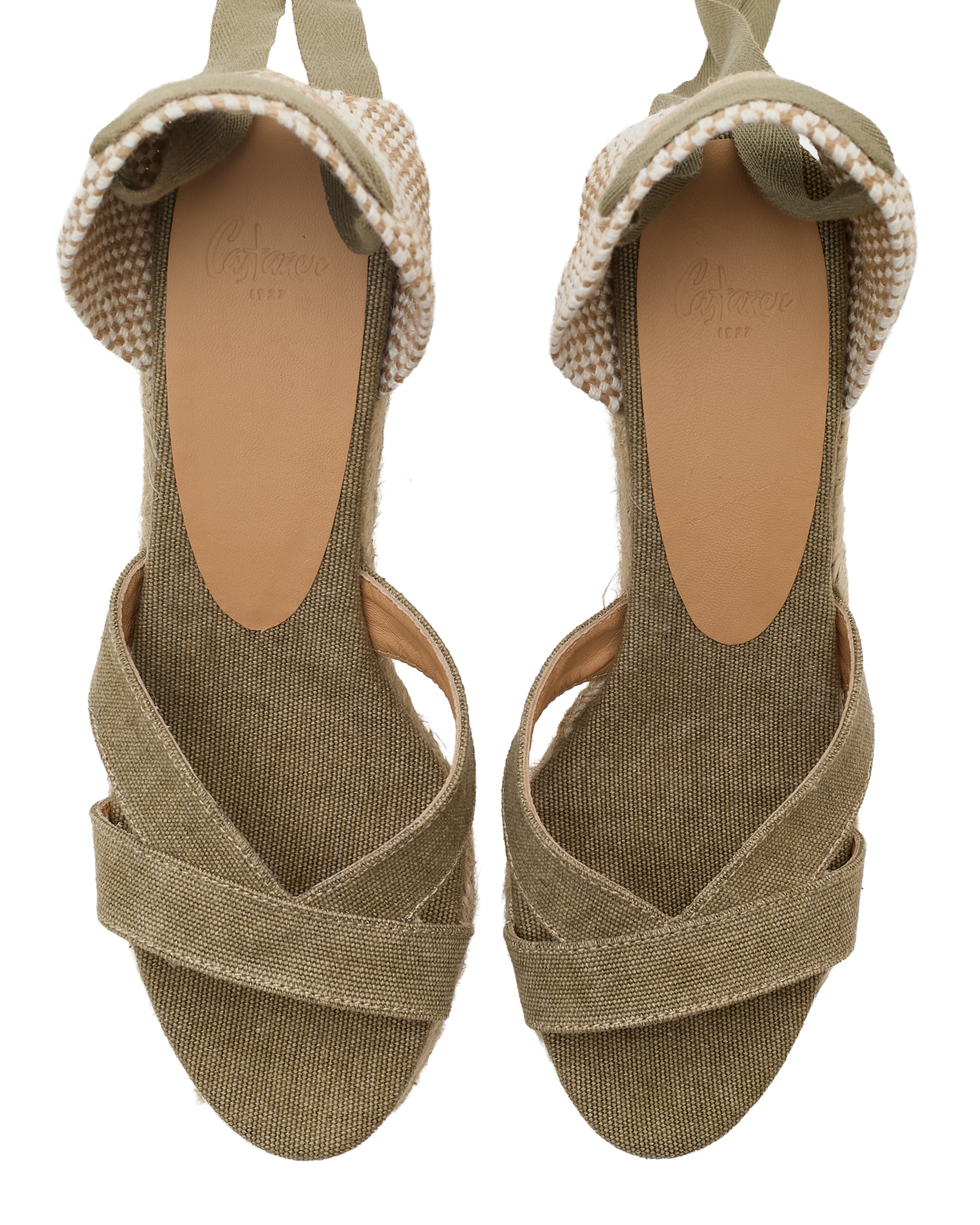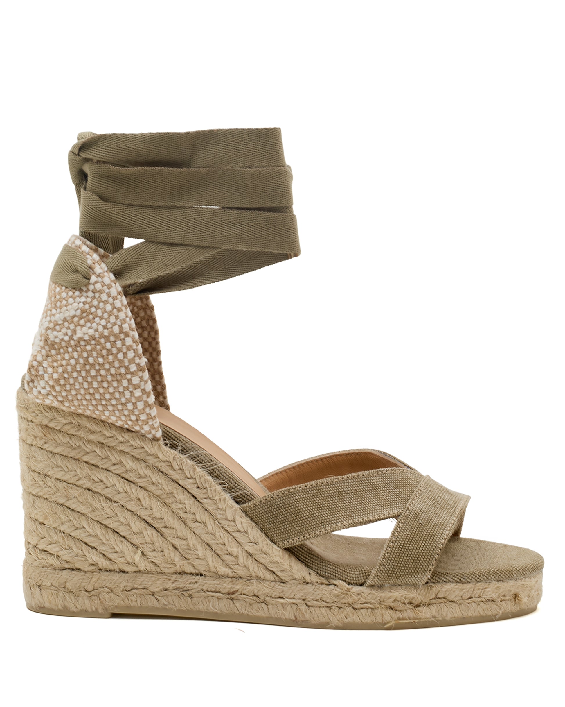 Bailey sandal with laces tied at the ankle, cushioned insole, and 9 cm jute wedge.