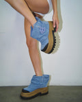 Introducing Dream, the chunky boot of the season with an asymmetric toe shape, designed for those who appreciate bold fashion statements. This boot features a wide leg fit, cute short cut leg, complemented by a distinctive Wolfe head ball charm for added flair. It also includes new rubber toe and heel pieces, combining durability with a modern aesthetic. Each pair has a hand crafted dirty finish. Perfect for trendsetters seeking both edge and elegance, this boot is a must-have for any fashion-forward wardrobe.