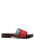 The MIRI slip-on clog sandal is a vibrant addition to your spring and summer wardrobe, designed to make a statement with its bold combination of premium materials and playful contrasts. Crafted from leather, suede, and pony hair, it features a distinctive layered design highlighted by a contrasting sock sleeve for added dimension. Antique-finished studs bring a touch of vintage sophistication, perfectly balancing the modern appeal of the wooden clog base. With its durable resin outsole, MIRI ensures all-day comfort and support, making it as practical as it is stylish. Available in four striking colourways, each blending bright summer hues and contrasting textures, these clogs are a celebration of effortless chic, perfect for elevating any warm-weather ensemble.