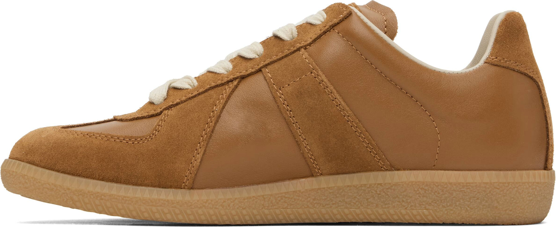 The Replica Sneakers from Maison Margiela offer a refined take on a classic athletic silhouette. Inspired by vintage German army trainers, this design features a rich blend of leather and suede in a sleek, neutral palette. With a soft lining and signature numbered logo, the Replica is a staple of the Maison's archive-inspired approach.