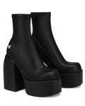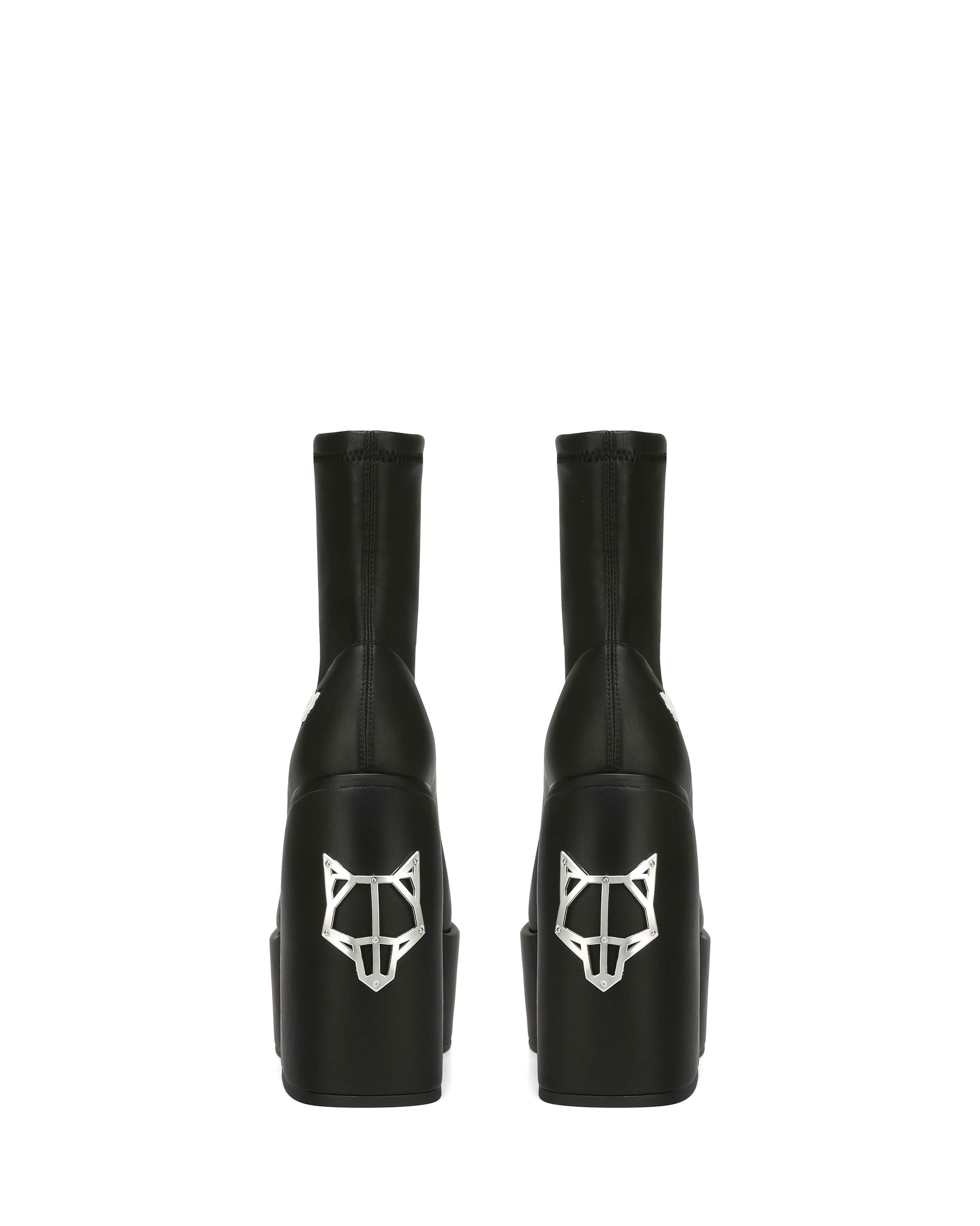 Ankle boot skin tight fitting platform made with a vegan friendly leg hugging stretch upper material on a custom designed Naked Wolfe platform and heel construction. Featuring our Naked Wolfe “wolfe” head plaque on the heel and a metal “wolfe” head plaque embedded into the heel.