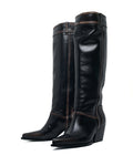 The TALL COWBOY boots combine a classic western silhouette with a modern, fresh twist. Crafted with a full leather upper featuring a vintage distressed finish, these boots offer a rugged yet refined look. The leather lining and footbed provide exceptional comfort, while the pull-on style adds ease of wear. With a 70mm heel height, they are a comfortable walking boot that doesn't compromise on style. The leather outsole and stacked heel ensure durability and sophistication. Made in Italy, these boots are the ultimate cool, contemporary statement piece—an absolute must-have this winter.