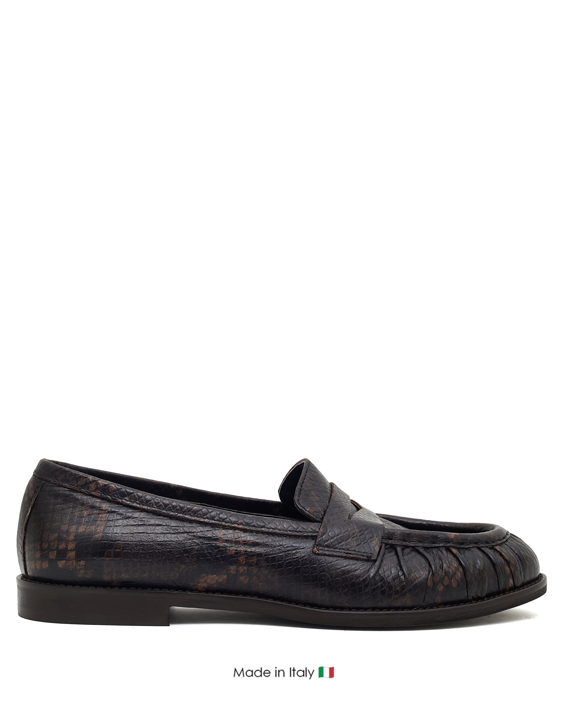 Step into sophistication with the Wren Loafer, an exquisite piece of Made in Italy footwear. Crafted from premium leather featuring a striking snake-embossed finish, these loafers blend timeless style with an adventurous texture, making them a true statement shoe for the discerning individual.